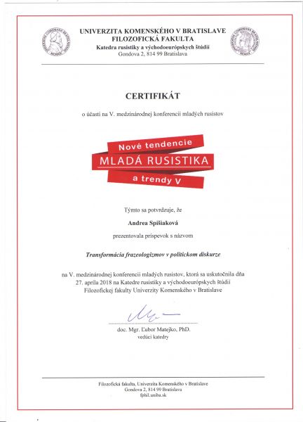 Na Katedre rusistiky a východoeurópskych štúdií Filozofickej fakulty Univerzity Komenského v Bratislave sa 27.04.2018 uskutočnila konferencia s názvom Mladá rusistika – Nové tendencie a trendy V., na ktorej vystúpila doktorandka Katedry rusistiky Andrea Spišiaková so svojim príspevkom Transformácia frazeologizmov v politickom diskurze.