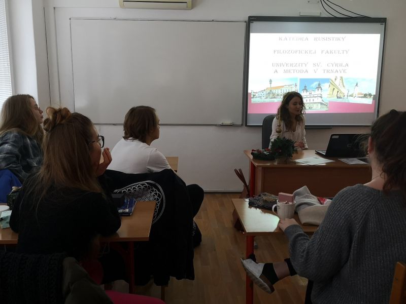 Napriek tomu, že pandemická situácia pretrváva aj v roku 2021, väčšinu z nás to však neodradilo. Práve naopak, podujatia sa aj naďalej organizujú v online priestore. Tomuto trendu sa prispôsobila aj naša katedra a zostala tak v kontakte nielen so študentmi, ale aj so širokou verejnosťou. V priebehu januára a februára 2021 sme preto spolu s dr. Olgou Iermachkovou a doktorandom Igorom Cintulom zorganizovali niekoľko virtuálnych stretnutí – road tripov so študentmi slovenských bilingválnych gymnázií s vyučovacím jazykom ruským. Konkrétne s Gymnáziom Alberta Einsteina, Gymnáziom Ivana Horvátha v Bratislave a Gymnáziom s rusko-slovenskou sekciou vo Vrábľoch. Takýmto spôsobom sme študentov v pohodlí ich domova oboznámili so všetkými výhodami, pre ktoré sa určite oplatí študovať na Katedre rusistiky FF UCM v Trnave a pokračovať tak v zdokonaľovaní sa v tomto bohatom a veľmi perspektívnom jazyku. Neopomenuli sme ani možnosť absolvovať štúdium v programe „dva diplomy“ a získať dva magisterské diplomy naraz, a to z Ruska a zo Slovenska, a zvýšiť si tak šancu na lepšie uplatnenie sa na trhu práce. Podelili sme sa tiež o zážitky zo stáží v Belgorode, Lipecku, Samare, Daugavpilse, Pule, Granade a iných mestách, informovali o možnosti individuálneho študijného plánu, výborných pedagógoch katedry, vrátane nositeľov jazyka, pestrom študentskom živote katedry, a v neposlednom rade o príjemnom prostredí Trnavy, ktorá je známa aj ako Malý Rím. Tešíme sa na budúcich poslucháčov katedry J.