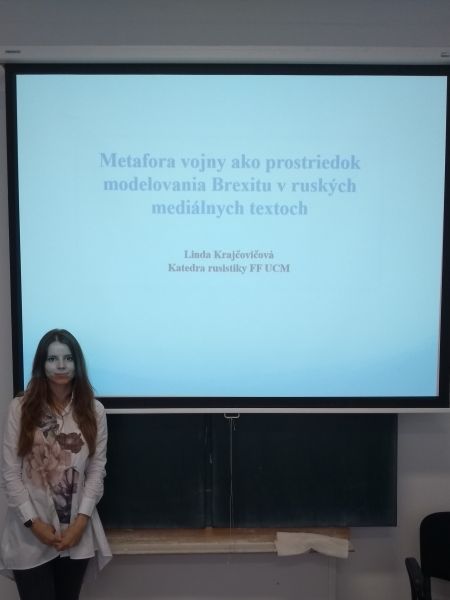 Doktorandka Linda Krajčovičová v dňoch 15.5 - 16.5.19 aktívne vystúpila na konferencii s príspevkom Метафора семьи как средство создания метафорического образа Евросоюза в российских СМИ, ktorá sa konala 15. a 16. mája na Belgorodskej štátnej národnej výskumnej univerzite v ruskom meste Belgorod. Okrem vystúpenia na konferencii, doktorandka navštívila aj dejisko najväčšej tankovej bitky druhej svetovej vojny, dedinku Prochorovka.