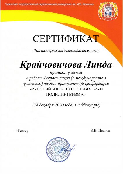 Dňa 18. decembra 2020 sa doktorandka Linda Krajčovičová prostredníctvom platformy Zoom zúčastnila konferencie s názvom Русский язык в условиях би- и полилингвизма, ktorú zorganizovala Čuvašská štátna pedagogická univerzita А. I. Jakovleva v meste Čeboksary, v Ruskej federácii. Doktorandka vystúpila s článkom Прецедентные имена как источник метафорического образа Брексита в российских СМИ.