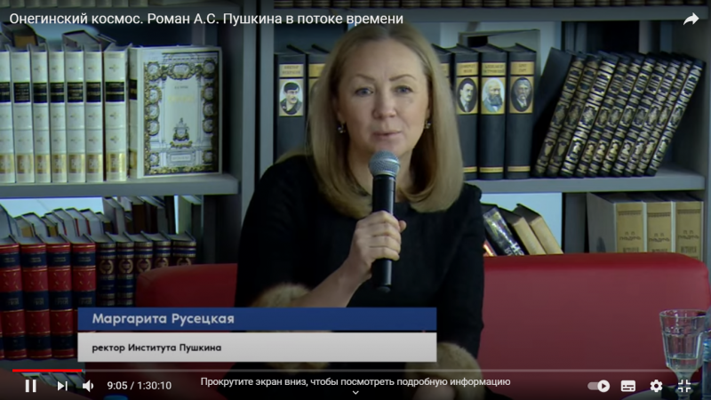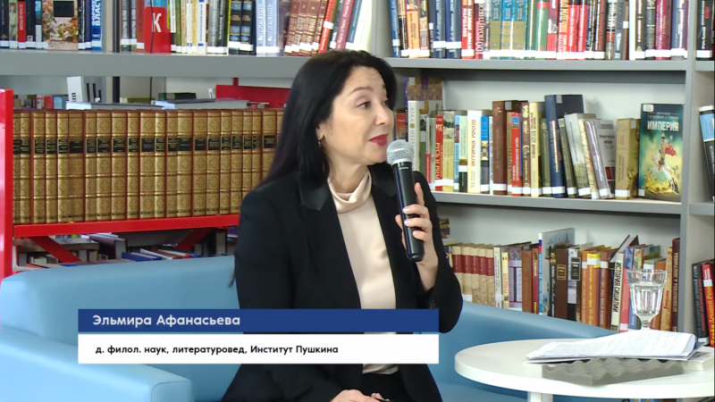 Ведущая Эльмира Афанасьева, доктор филологических наук, литературовед, руководитель Пушкинских проектов института А. С. Пушкина рассказала об истории создания «Евгения Онегина», о мотиве движения времени, которым открывается роман, о мире самого автора.