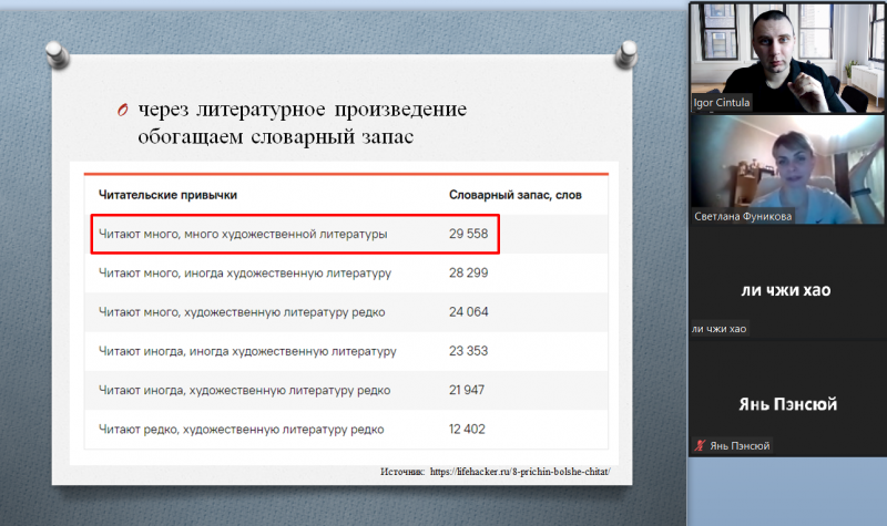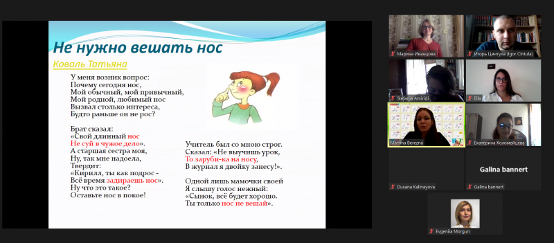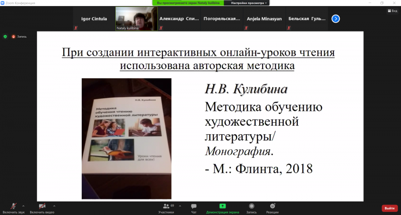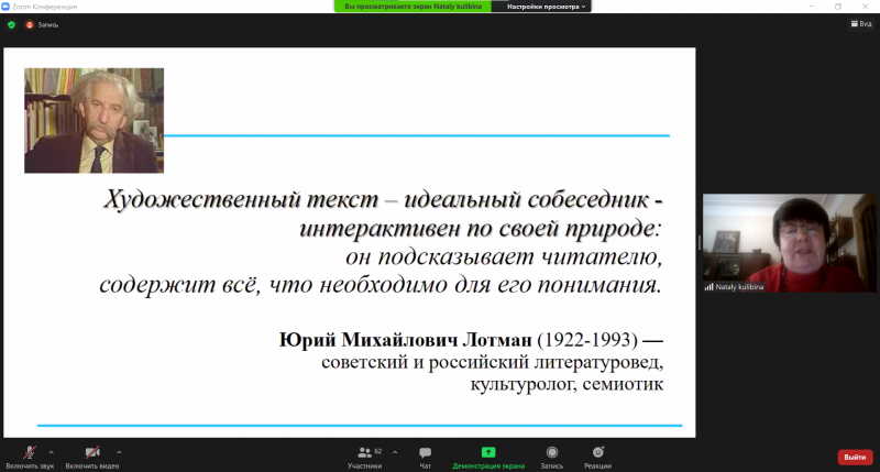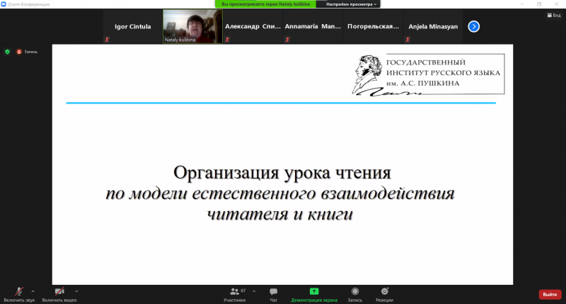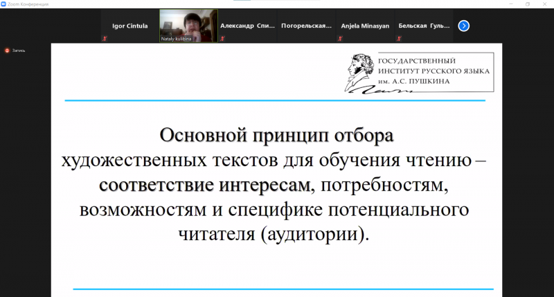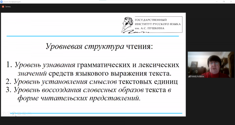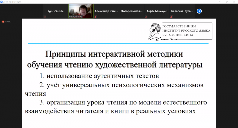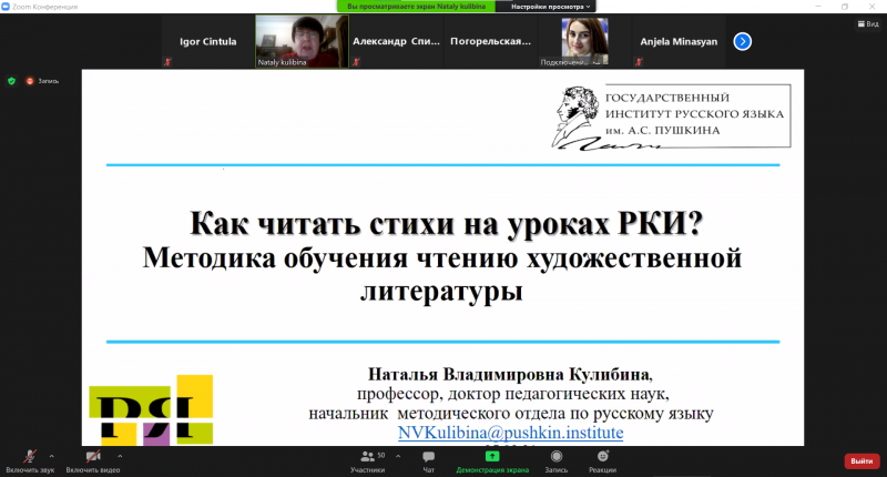 Vo štvrtok 25. marca 2021 sa na portáli „Vzdelávanie v ruštine“ v rámci cyklu vedecko-metodických webinárov zameraných na štúdium ruskej literatúry 19. a 20. storočia a výučbu čítania literárnych textov uskutočnil webinár na tému „Как читать стихи на уроках РКИ (методика обучения чтению художественной литературы)“, ktorý viedla Natália Vladimirovna Kulibina – doktorka pedagogických vied, profesorka a vedúca pracovníčka metodického oddelenia ruského jazyka Puškinovho inštitútu v Moskve. Webinár bol zameraný na metodiku čítania a analýzy literárnych diel s prihliadnutím na univerzálne psychologické mechanizmy čítania a prirodzenú vzájomnú interakciu medzi čitateľom a knihou.