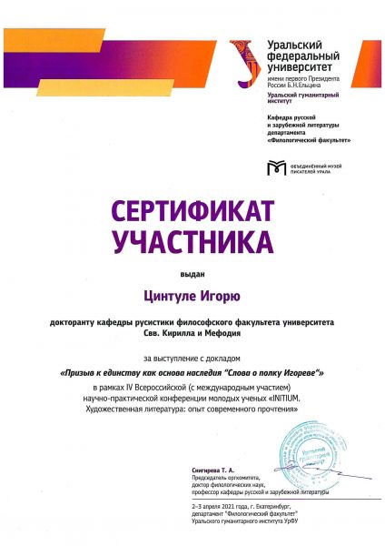19 марта 2021 аспиранты Универитета Св. Кирилла и Мефодия в Трнаве посетили церемонию вручения литературной премии журнала «Урал». Торжественная церемония проходила в Ельцин Центре, г. Екатеринбург. В торжественной обстановке редакция журнала «Урал» объявила лауреатов своей премии.