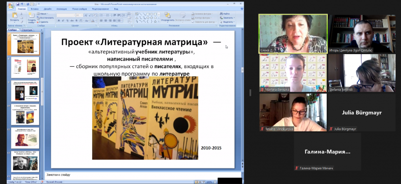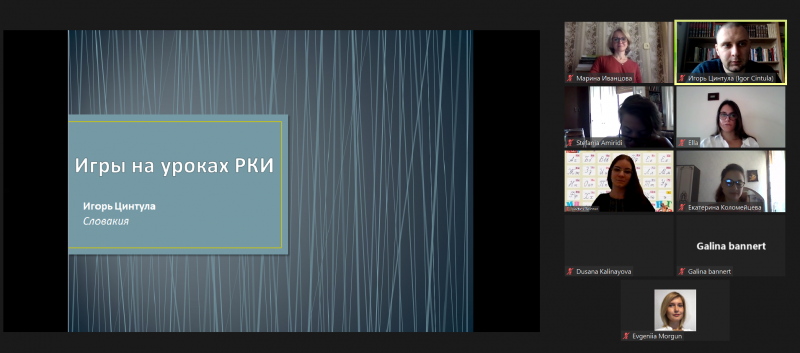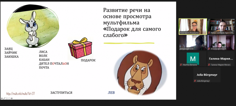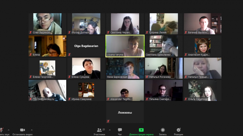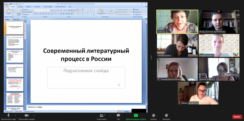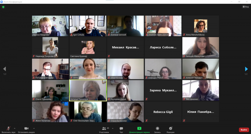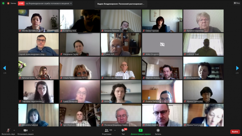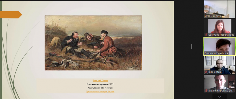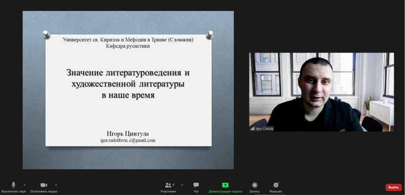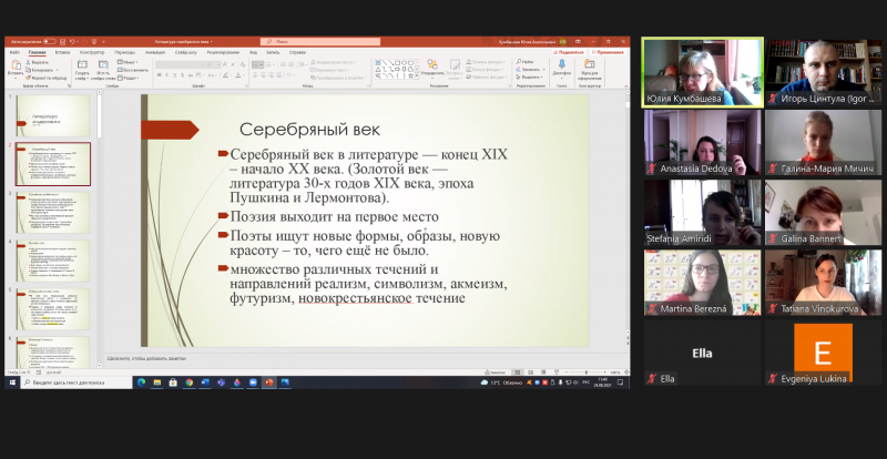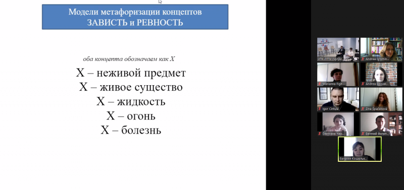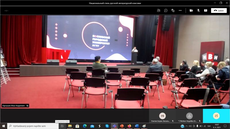 3 марта 2021 года докторант кафедры русистики философского факультета Кошелькова Евгения присутствовала на заседании кафедры филологии Историко-филологического факультета НИУ «БелГУ» по приглашению Чума-Жунь Ирины Ивановны, заведующей кафедры. Главной повесткой заседания стала предзащита диссертационной работы Мальцевой Гаяне Юриковны «Игровые аспекты репрезентации макроконцепта «ЖИЗНЬ» в художественном дискурсе (на материале русскоязычной прозы В.В. Набокова)». Также в рамках этого заседания Евгения Кошелькова выступила с докладом об опыте поступления и обучения в Университете Св. Кирилла и Мефодия в г. Транава в условиях пандемии. Аспиранты НИУ «БелГУ» задавали вопросы о требованиях преподавателей, организации учебных занятий и преподавательской деятельности.