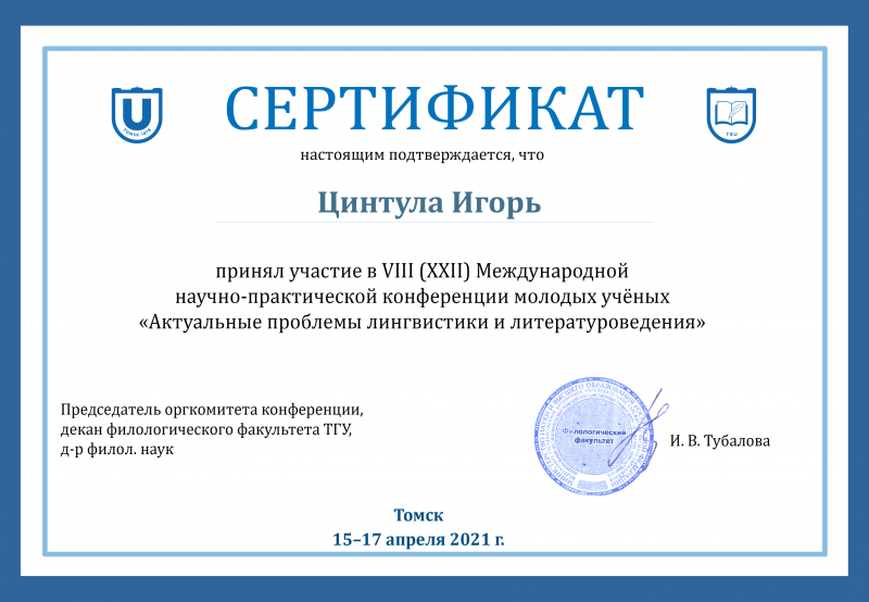 V dňoch 15.-17. apríla 2020 sa v Tomsku, v Ruskej federácii, konala online medzinárodná konferencia s názvom VIII (XXII) Международная научно-практическая конференция молодых учёных: Актуальные проблемы лингвистики илитературоведения, ktorú zorganizovala Filozofická fakulta Národnej výskumnej Tomskej univerzity pre študentov, absolventov magisterského štúdia, doktorandov a mladých vedeckých pracovníkov do 35 rokov. Konferencie sa aktívne zúčastnila doktorandka Linda Krajčovičová s príspevkom Морбиальная метафора как средство моделирования Брексита в российских медиатекстах.