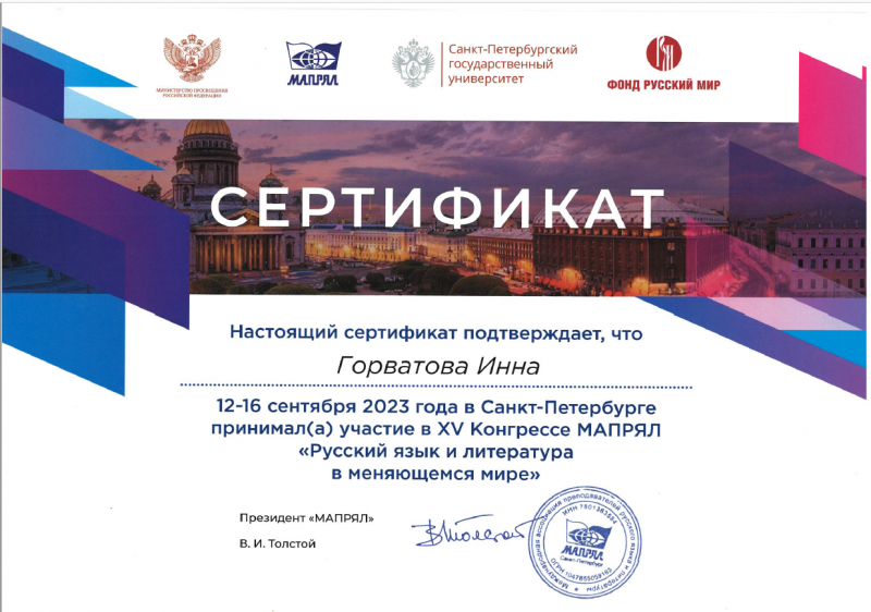 В период с 29 сентября по 31 октября 2023 она слушала лекции по дисциплинам, близким её научным интересам, в Нижегородском государственном университете им. Н.И. Лобачевского. Больше всего ей запомнилась работа на курсах Радбиля Тимура Беньюминовича, д.ф.н., профессора, и Сандаковой Марины Всеволодовны, д.ф.н., профессора.