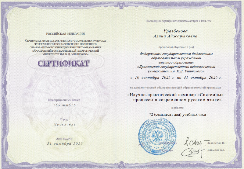 В первом семестре 2023–2024 учебного года аспирантка первого курса обучения Алина Уразбекова прошла научные стажировки в ведущих научных организациях Российской Федерации.