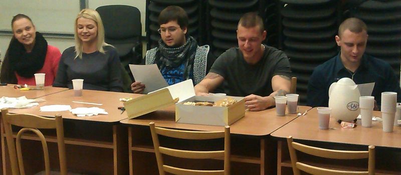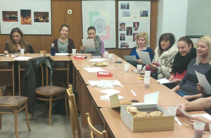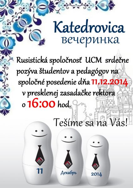 Z iniciatívy študentov Katedry rusistiky sa 11. decembra 2014 uskutočnila prvá katedrová „večerinka“, teda neformálne stretnutie poslucháčov všetkých študijných programov a členov katedry. Celý večer sa niesol v znamení inscenácií rôznych rolí, vtipných situácií, rečňovaniek či iných hier. Nechýbala nám dobrá nálada a skvelá zábava. "Zlatým klincom" podujatia bol večer ruských filmov. Veríme, že sa toto podujatie stane obľúbenou katedrovou tradíciou J