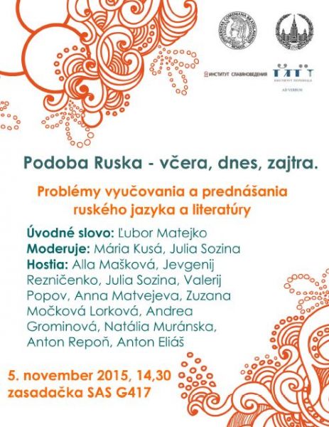 5. novembra 2015 sa na pôde Katedry ruských a východoeurópskych štúdií FF Univerzity Komenského v Bratislave konala vedecká rozprava o prekladaní ruskej a slovanských literatúr s názvom Podoba Ruska – včera, dnes, zajtra. Rozpravy sa zúčastnili zástupcovia Slovanského ústavu Ruskej akadémie vied a jej novovytvoreného Prekladateľského ústavu, profesorka A. G. Mašková, DrSc. z Katedry slovanských filológií MGU v Moskve, slovenskí prekladatelia ruskej literatúry – prof. PhDr. J. Zambor, CSc. a J. Štrasser, a tiež pedagógovia všetkých rusistických pracovísk na Slovensku. Našu Katedru reprezentovala Mgr. Andrea Grominová, PhD., ktorá v rámci diskusie vystúpila s príspevkom Ruská poézia v slovenskej kultúre v prvých rokoch nového tisícročia.