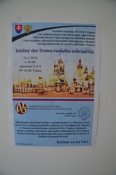 Katedra rusistiky FF UCM v Trnave 23. februára 2016 uskutočnila slávnostné odovzdávanie 300 kníh, ktoré v rámci programu Knižnej pomoci Dom ruského zahraničia Alexandra Solženicyna v Moskve daroval Univerzite sv. Cyrila a Metoda v Trnave. Slávnostné otvorenie výstavy sa konalo za účasti pána rektora UCM v Trnave, Dr.h.c. doc. Ing. Jozefa Matúša, CSc., mim. prof., kultúrneho atašé Ruskej federácie na Slovensku, Vladislava Kulikova, zástupcu Domu ruského zahraničia Alexandra Solženicyna, Vladimira Sergejeviča Ugarova, riaditeľa Ruského centra vedy a kultúry v Bratislave Sergeja Žiganova, predstaviteľov akademickej obce a študentov UCM v Trnave.