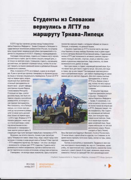 V spomínanom časopise Politechnik bol uverejnený aj článok študenta Katedry rusistiky Igora Cintulu, ktorý absolvoval študijný pobyt na Lipeckej štátnej technickej univerzite už po tretíkrát. Igor Cintula píše o možnostiach štúdia na tejto univerzite a hlavne o prínose zahraničného pobytu pre každého študenta, ktorý využije možnosti pobytov, ktoré ponúka Katedra rusistiky FF UCM.