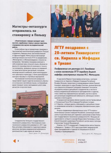 Články o Univerzite sv. Cyrila a Metoda sa objavili v časopise Lipeckej štátnej technickej univerzity Politechnik (№ 8, október 2017)