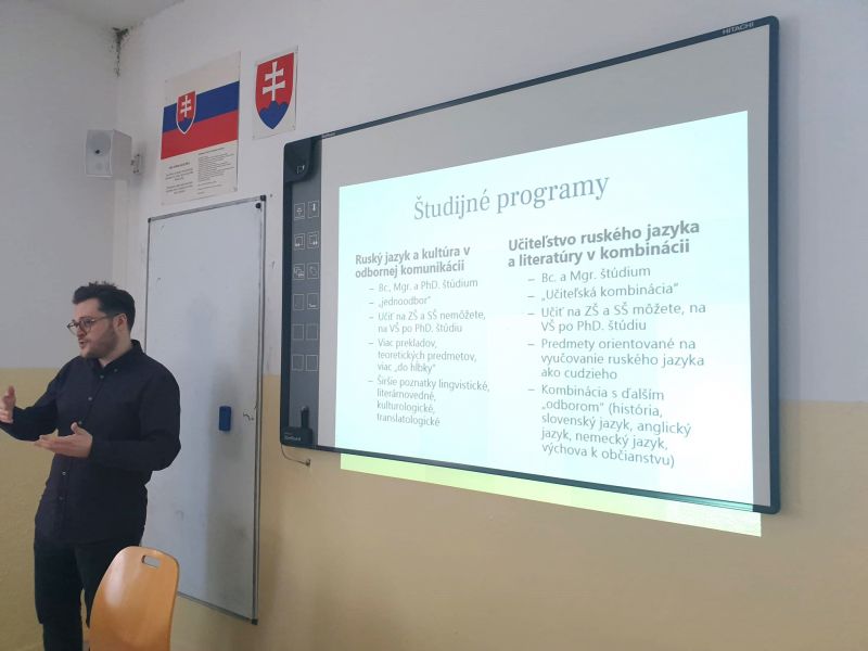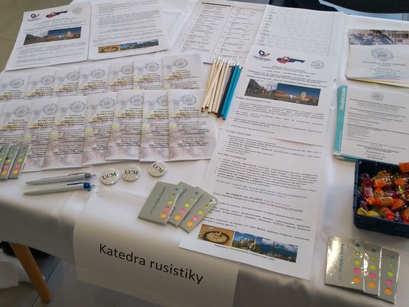 16. február 2018 sa na Filozofickej fakulte našej Univerzity sv. Cyrila a Metoda v Trnave niesol v duchu Dňa otvorených dverí. Od 8:30 do 13:00 sa mohli záujemcovia o štúdium ruského jazyka na našej univerzite zastaviť pri prezentačnom stánku Katedry rusistiky FF UCM. Na tomto mieste sa mohli dozvedieť všetky základné informácie o tom, ako funguje naša katedra. Prítomní boli naši študenti, s ktorými mohli záujemcovia diskutovať o možnostiach, aké ruský jazyk ponúka dnes, aké majú oni svoje dojmy z prebiehajúceho štúdia a vyhliadky do budúcnosti.