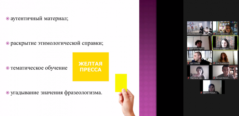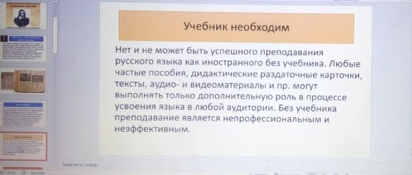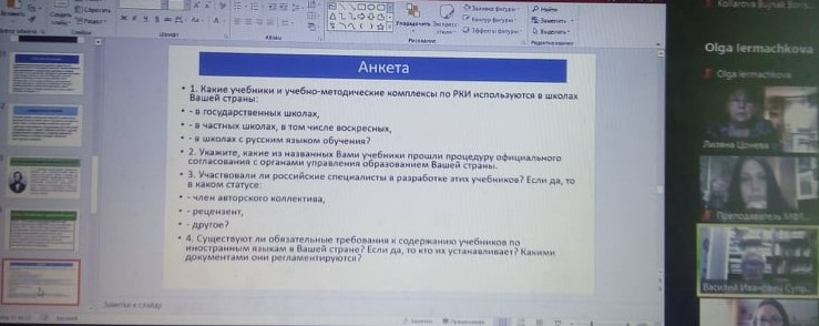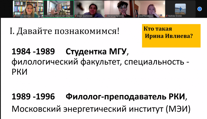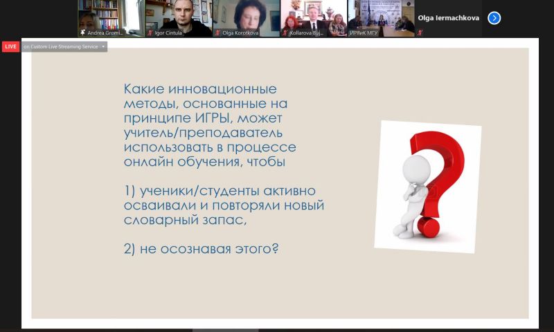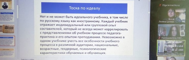 Отдельно хочется отметить работу Жанны Гапоновой, к.ф.н., декана факультета русской филологии и культуры ЯГПУ им. К.Д. Ушинского, а также ее коллеги Екатерины Мельниковой, к.ф.н., доцента кафедры русского языка, которые не только подготовили материалы и оформили их в квизы, квесты, игры и презентации, но и поддерживали благожелательную атмосферу среди всех участников, проводили индивидуальные консультации и поделились наработками для использования их в классах со студентами, изучающими русский язык как иностранный.