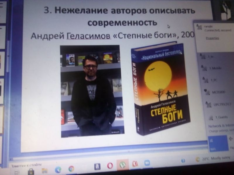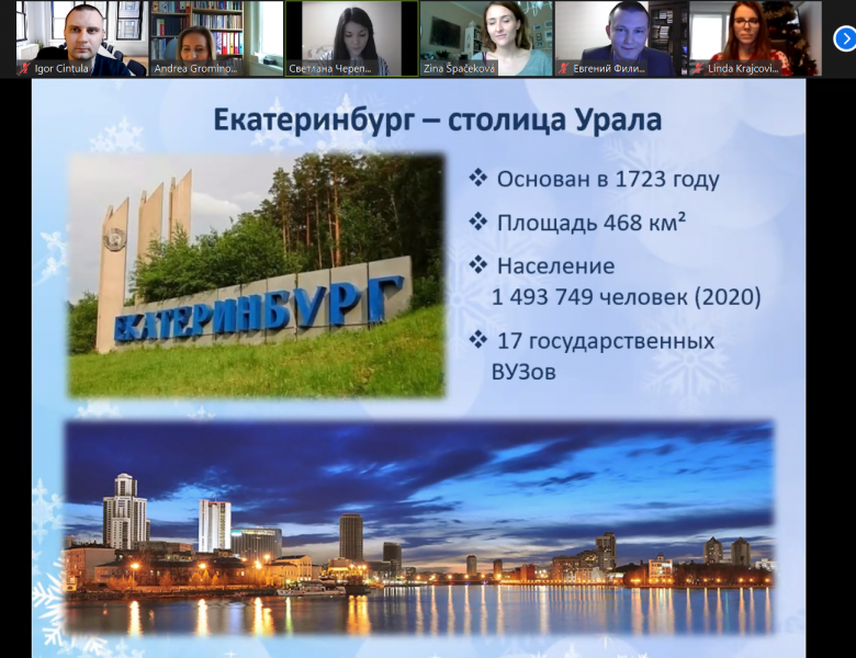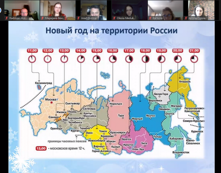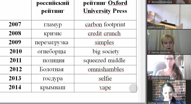 15. decembra 2015 sa pri príležitosti Roku literatúry v Rusku prvýkrát na pôde Katedry rusistiky FF UCM v Trnave uskutočnil okrúhly stôl cez skype pod vedením profesorky N. V. Barkovskej, DrSc., ktorá je momentálne na vedecko-výskumnom pobyte na našej Katedre. Jej študenti z Uralskej štátnej pedagogickej univerzity v Jekaterinburgu diskutovali s našimi poslucháčmi o knižných novinkách, vydaných v Rusku i na Slovensku, o svojich dojmoch z prečítaného a tiež o otázkach, ktoré môžu potenciálne vzniknúť pri oboznamovaní sa s literatúrou svetovej proveniencie. „Čerešničkou na torte“ bolo skype-stretnutie so súčasnou ruskou spisovateľkou Annou Matvejevovou. Autorka románov a poviedok a laureátka ceny Veľká kniha 2015 rozprávala o inšpirácii vo svojej tvorbe a s radosťou odpovedala na pestrú škálu otázok študentov i vyučujúcich. Tešíme sa na ďalšie stretnutie tohto typu :)