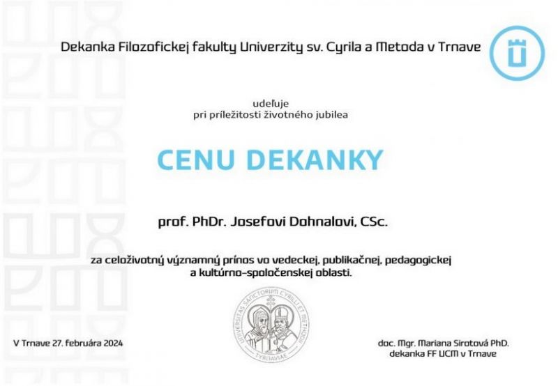 Dňa 4. decembra 2017 prezident Slovenskej republiky Andrej Kiska vymenoval 30 nových profesorov a profesoriek vysokých škôl. Titul "profesor" udelil aj členovi našej katedry – pánovi doc. PhDr. Josefovi Dohnalovi, CSc., za oblasť cudzie jazyky a kultúry. Viac informácií si môžete prečítať tu: https://www.prezident.sk/article/prezident-vymenoval-30-profesorov-apeloval-na-kvalitu-skolstva/