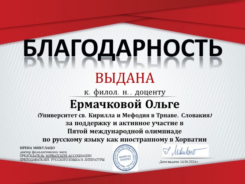 14. júna 2025 sa uskutočnila VI. medzinárodná olympiáda z ruského jazyka ako cudzieho v Chorvátsku, ktorú každoročne organizuje HAPRYAL v online formáte. Tento rok sa olympiády zúčastnilo 77 súťažiacich z Európy, Ázie a Južnej Ameriky. Súťažiaci rozprávali o svojich mestách, obľúbených knihách a filmoch, význame priateľstva, ruských tradíciách, budúcom povolaní a zarecitovali aj básne. V porote pôsobila aj členka našej katedry doc. Olga Iermachkova.