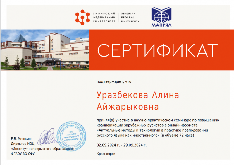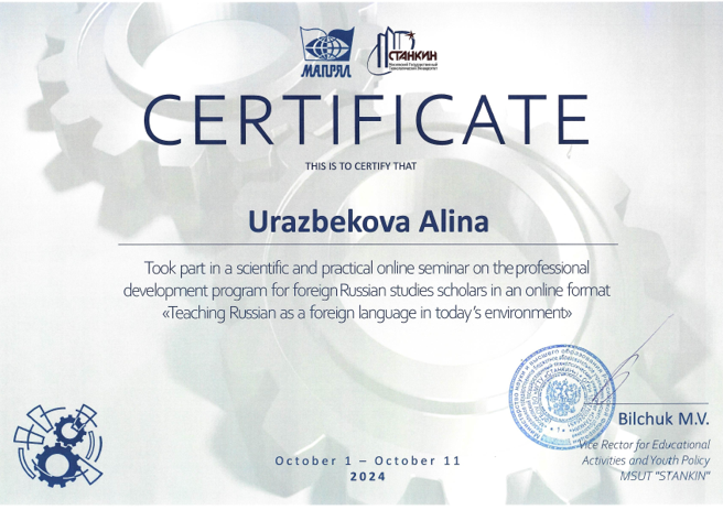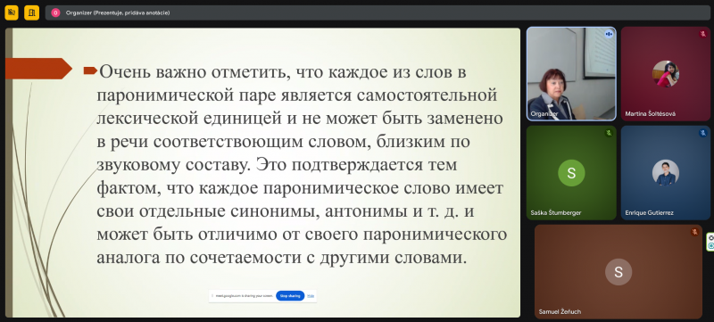 В период с 10 сентября по 31 октября 2025 г. доцент Кафедры русистики Философского факультета Университета Свв. Кирилла и Мефодия в Трнаве Ольга Ермачкова, к.ф.н., и аспирант того же подразделения Алина Уразбекова прошли дистанционное обучение в Федеральном государственном бюджетном образовательном учреждении высшего образования «Ярославский государственный педагогический университет им. К.Д. Ушинского». В процессе работы, подготовительный этап которой начался еще 26 мая, преподаватели из 42 стран – от Турции и Индии до Мексики и Аргентины – освежали свои знания по следующим направлениям: «Системные процессы в современной русской орфоэпии», «Современная орфографическая норма и варианты», «Системные процессы в лексике современного РЯ», «Словообразование современного РЯ», «Социокультурная и социолингвистическая составляющая языкового материала в методике преподавания РКИ», «Системные процессы в морфологии современного РЯ» и «Системные процессы в синтаксисе современного РЯ». Программа повышения квалификации «Системные процессы в современном русском языке» дала возможность участникам учебного курса ознакомиться с последними тенденциями в преподаваемых дисциплинах, а также обсудить с коллегами со всего мира темы, вызывающие затруднения как в процессе объяснения, так и в процессе восприятия.