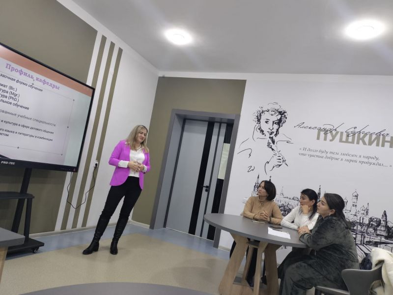 Poslucháči Kazašskej univerzity, ktorí aktívne absolvujú akademické stáže na Euroázijskej akadémii v Bratislave, sa 6. novembra 2014 zúčastnili prednášok vedúcej katedry – doc. PhDr. Tatiany Grigorjanovej, CSc. Keďže sú študijné programy Euroázijskej akadémie zamerané na cestovný ruch, lingvistiku a cudzie jazyky (vrátane ruského), veríme, že prednášky pani docentky Grigorjanovej boli obohatením ich poznatkov o frazeológii, lexikológii a morfológii súčasného ruského jazyka.